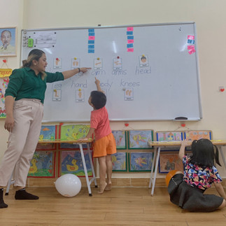 Đây cũng chính là chủ đề chính và vô cùng hấp dẫn của CLB Tiếng Anh của tháng. Thông qua các trò chơi thú vị như “Classifying the colors”, “Arranging words”, và “My body”, các bé được vừa học vừa chơi, rèn luyện kỹ năng phản xạ trong giao tiếp. Các con nghe, hiểu, trả lời được các câu hỏi đơn giản : “What present will you give for your teacher?”, “What can you do to make your teachers happy?” cũng như nói được các câu ngắn đơn giản “ I love you, teacher”; “Happy Teacher’s Day”, “I like English”, “do you like flowers, Ms?” theo đúng chủ đề mà các thầy cô yêu cầu. Ngoài ra các Thầy cô còn ngạc nhiên hơn vì qua tình cảm tự nhiên dành cho Thầy cô các Bé đã ôm và líu lo không rời với những câu nói đáng yêu bất ngờ dành cho các cô Caryl , Vivient hay Thầy Paul…